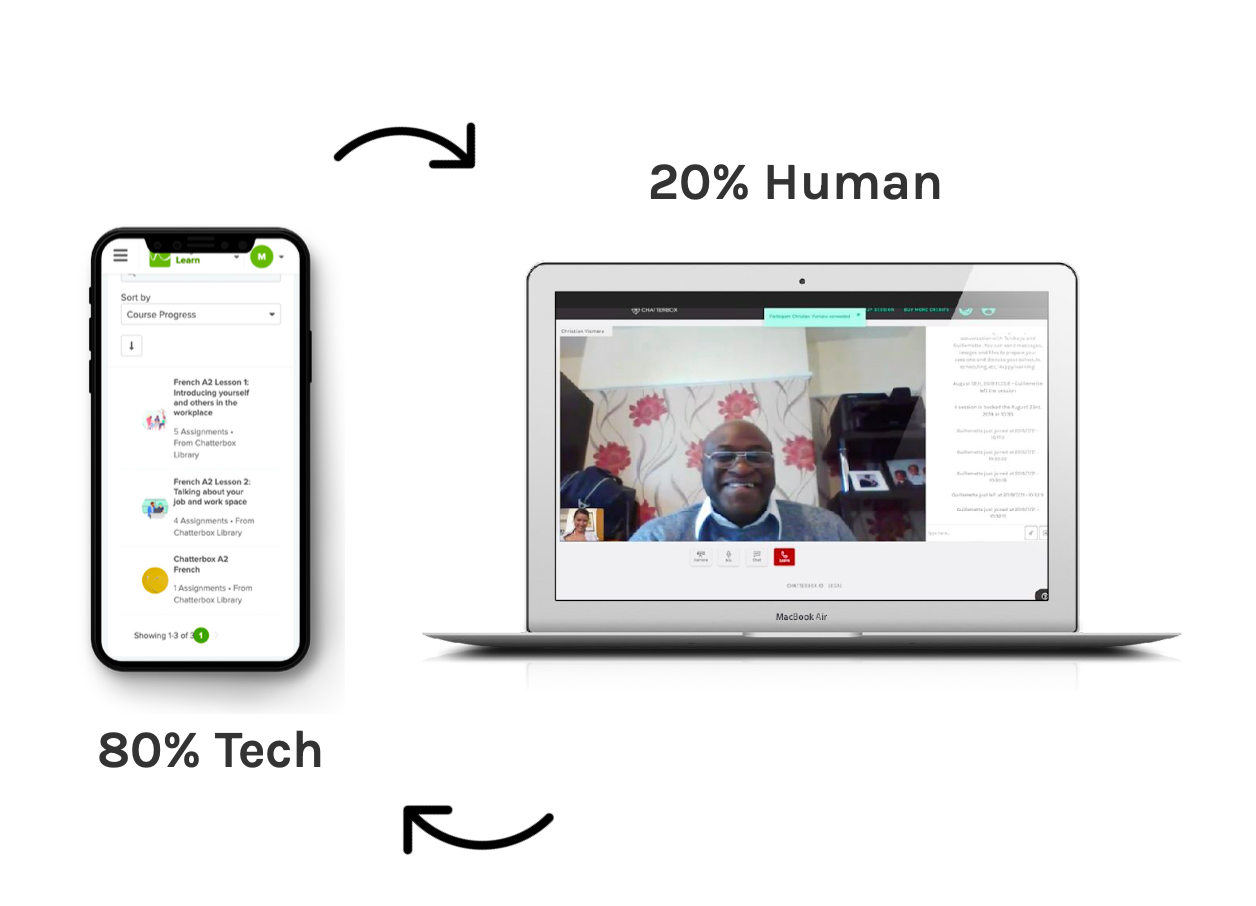 Chatterbox uses a blended learning approach, combining flexible self-study with live speaking practice.