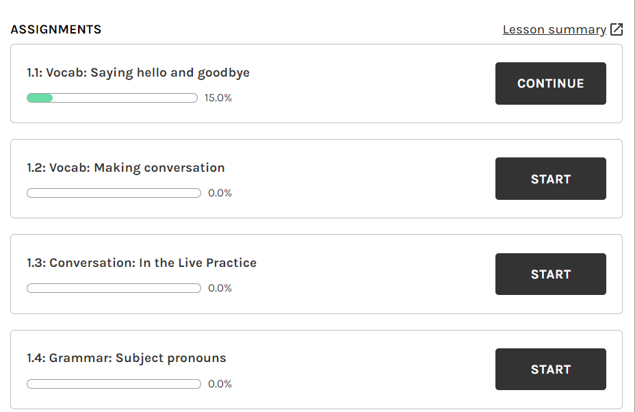 Work through all self-study assignments in the Lesson 1 before your Live Practice. We recommend you dedicate 10 to 15 minutes per day.