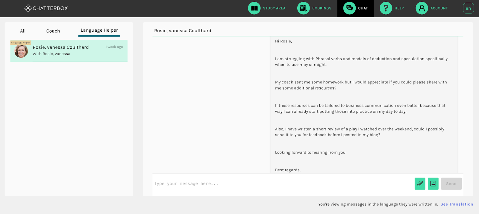 If during a Live Practice you ask to review a specific grammar point or need extra support, your coach can coordinate with the Language Helper to provide additional resources. You can also message the Language Helper directly via the chat yourself at any time.